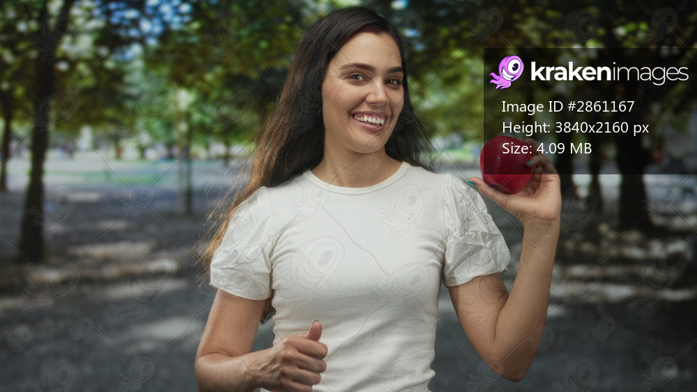 Woman holding red apple with right hand on a tree lined park pathway under dappled sunlight; happiness.