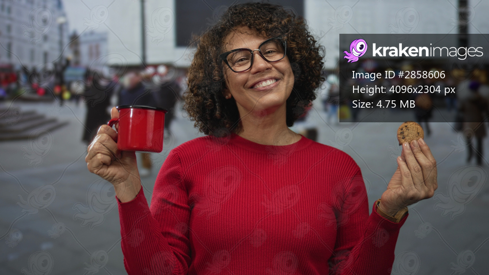 Woman holding red ceramic mug and chocolate chip cookie on city street among blurred background crowd; morning joy ritual.