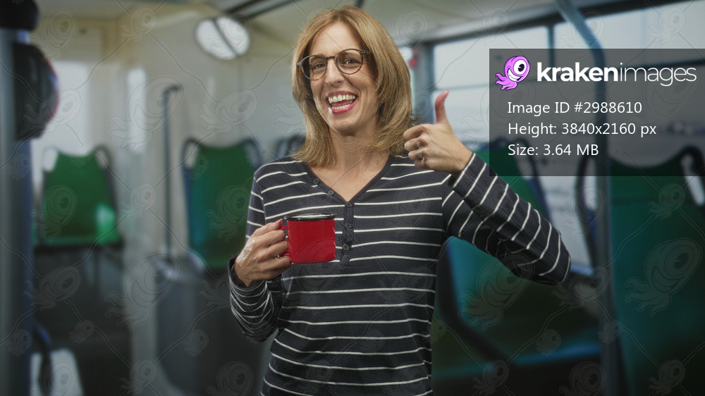 Woman holding red coffee mug and giving thumbs up in a commuter bus on street, smiling and looking at camera; joy travel comfort.