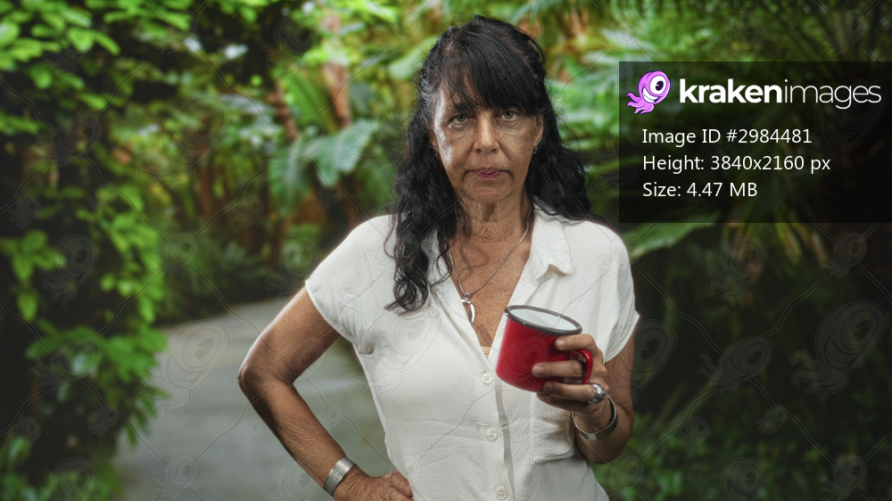 Woman holding red coffee mug with hand on hip in forest pathway, wearing white shirt and silver bracelet; contemplation resilience.
