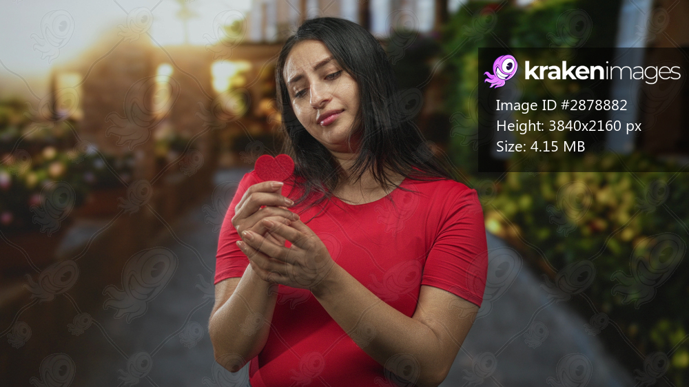 Woman holding red felt heart in her hands on a cobblestone street, examining it with a pensive frown; heartbreak sadness.