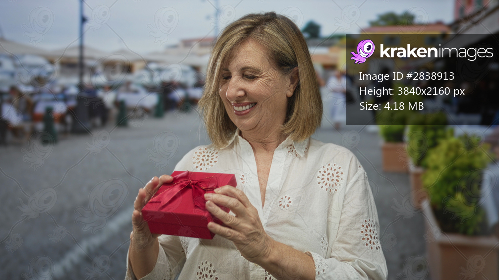 Woman holding red gift box with hands visible and smiling on a cobblestone street lined with cafes and planters; joy.