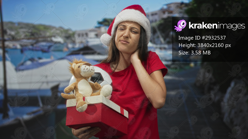 Woman holding red gift box with plush lion and soccer ball, hand on neck on a street near boats and marina; holiday fatigue.