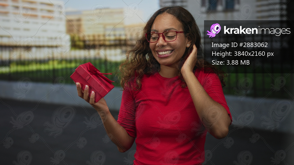 Woman holding red gift box and smiling while touching hair on street near building fence; celebration joy.