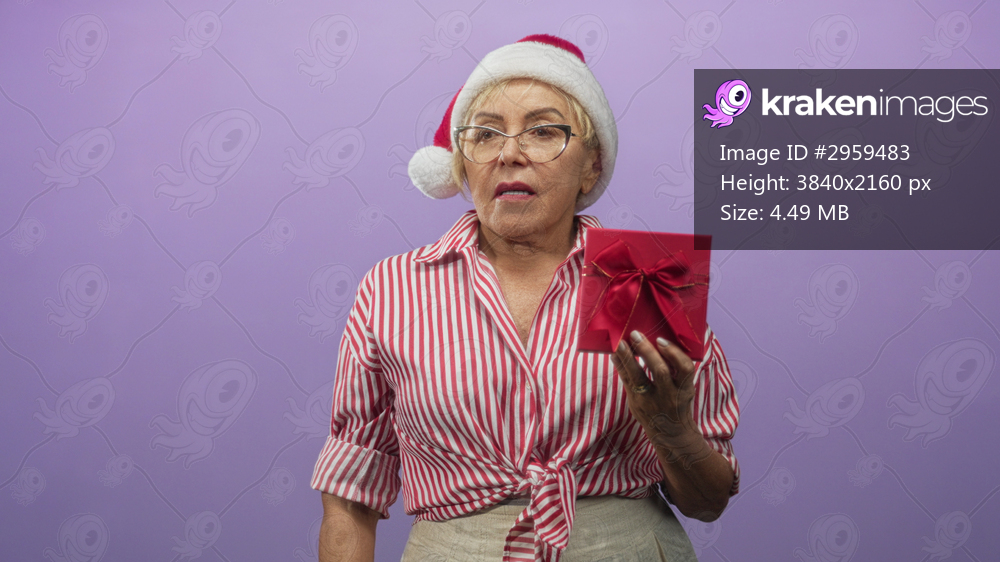 Woman holding red gift box, wearing santa hat, striped shirt and glasses against purple backdrop in studio; quiet contemplation.