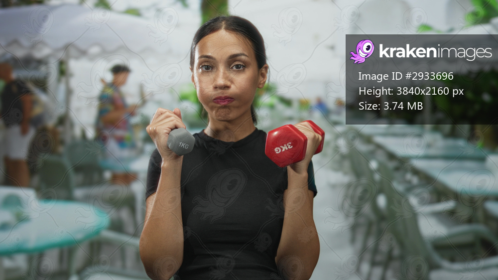 Woman holding red and gray dumbbells on a restaurant terrace outdoors, smiling while curling weights with both hands; health motivation confidence.