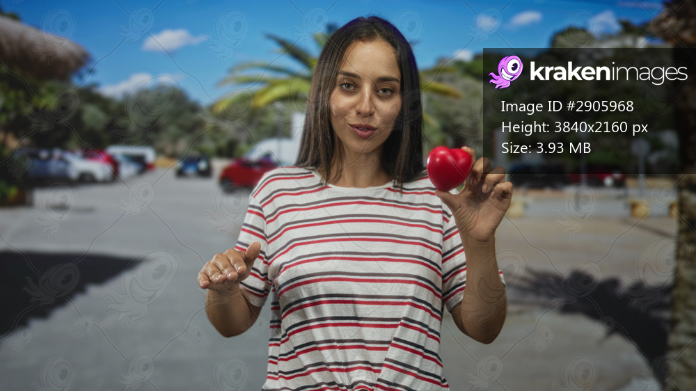 Woman holding red heart and gesturing while speaking on a sunny street with palm trees and parked cars; love message.