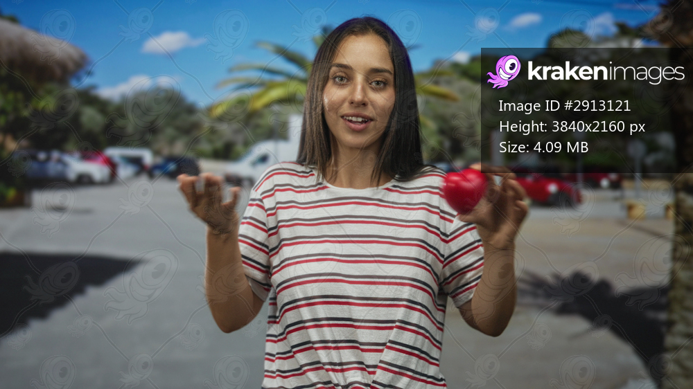 Woman holding red heart and gesturing while speaking on a sunny street with palm trees and parked cars; love message.