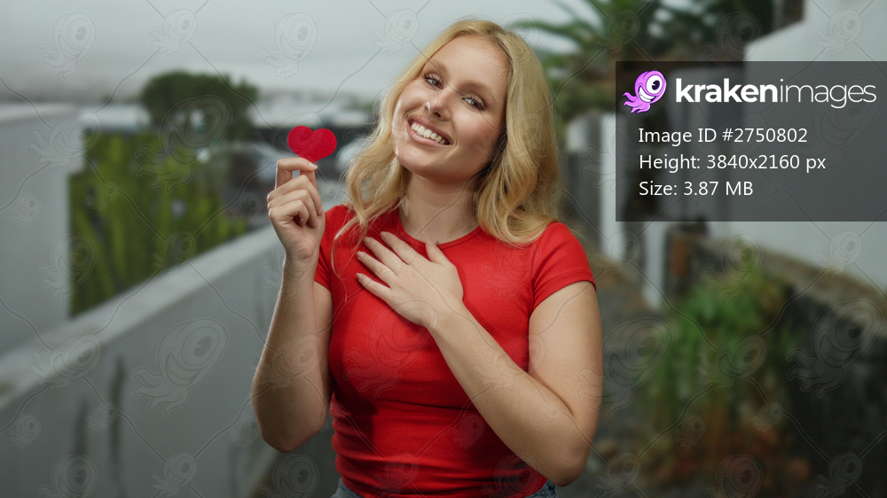 Woman holding red heart outdoors in urban area with blonde hair smiling in a city street wearing a red shirt