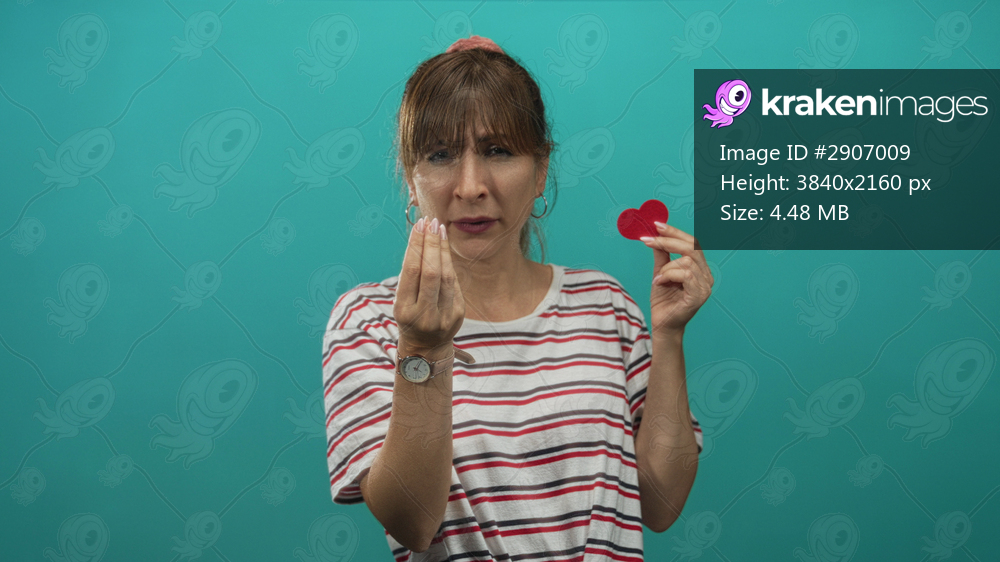 Woman holding red heart with right hand and pinched fingers gesture toward camera in turquoise studio; heartbreak pleading.
