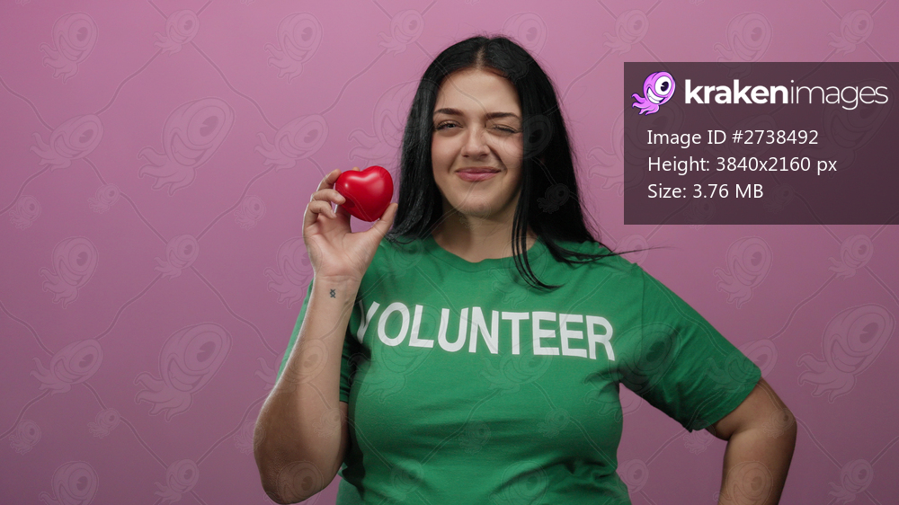 Woman holding red heart-shaped object smiling confidently wearing volunteer shirt against pink background highlighting community and kindness.