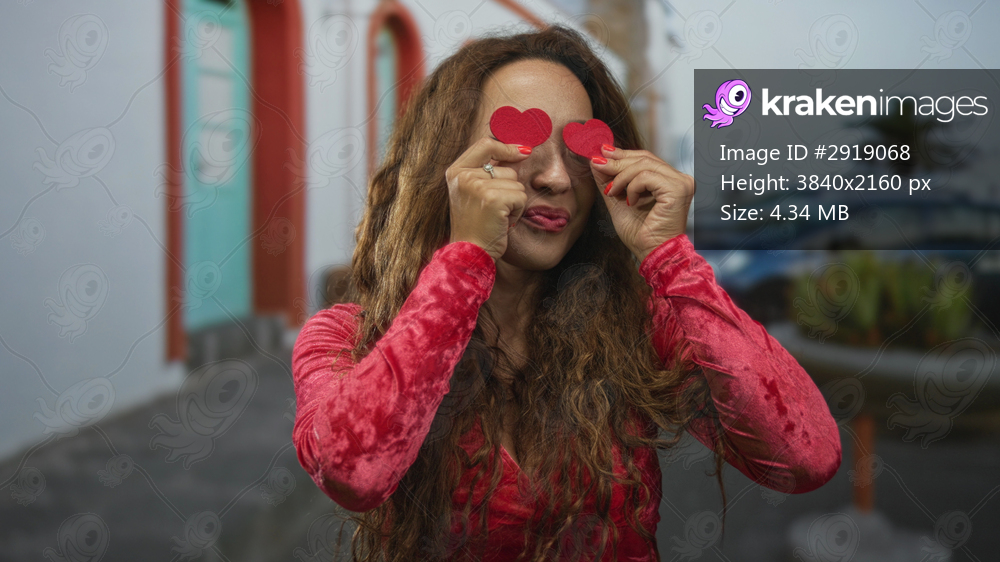 Woman holding red heart shapes over eyes with both hands on a street by colorful building facades; playful love.