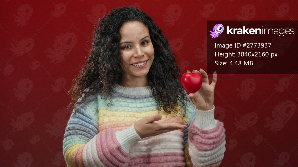 Woman holding red heart and showing thumbs up on an isolated red background, expressing positivity and love in a cheerful, colorful setting, perfect for valentine promotions. - Kraken Images