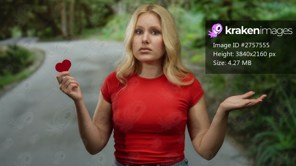 Woman holding red heart wearing red shirt with puzzled expression in green park surrounded by lush trees and pathways, conveying love and confusion.