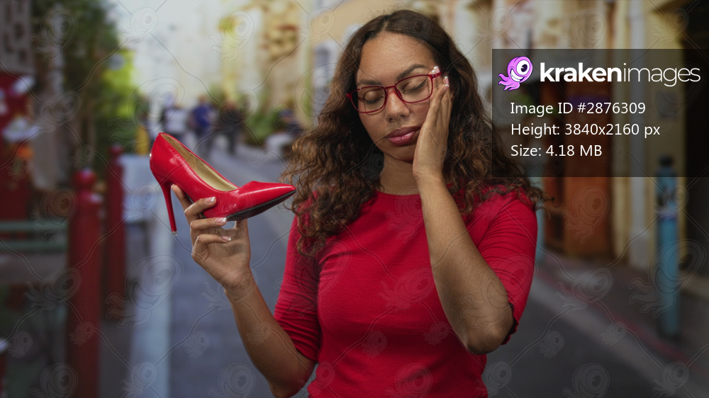Woman holding red highheel shoe and hand on cheek for toothache on a busy city street wearing red top and glasses; discomfort.