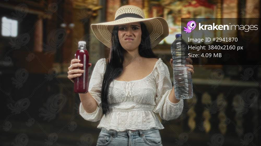 Woman holding red juice bottle and clear water bottle, grimacing while comparing drinks in a church; disgust choice.
