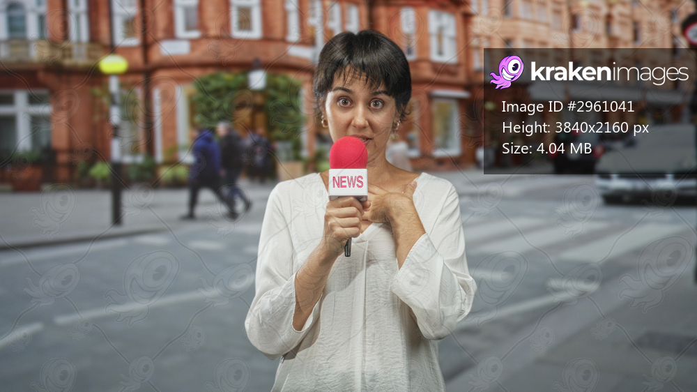 Woman holding red microphone labeled news, pointing thumb to chest while speaking into mic on street in front of brick building; concerned reporting.