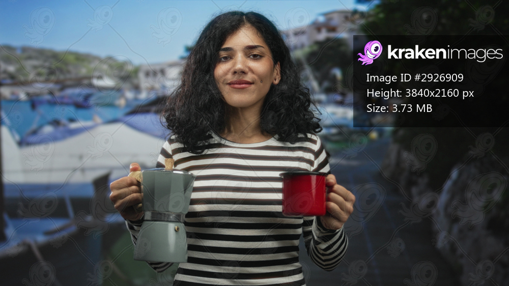 Woman holding red mug and coffeepot on a seaside street with boats at a port; morning ritual contentment.