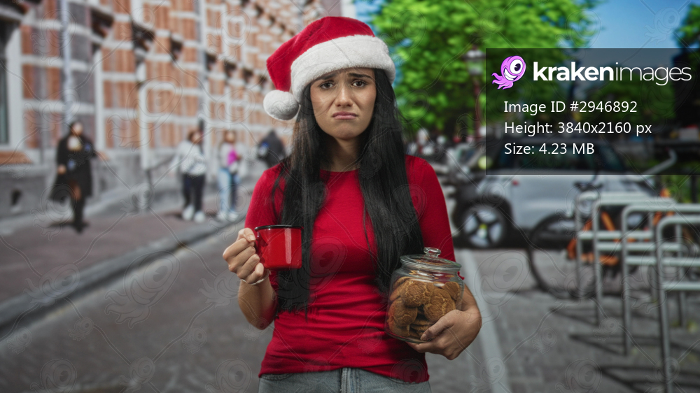 Woman holding red mug and cookie jar on city street wearing santa hat and frowning, hand gripping jar and mug; holiday disappointment.