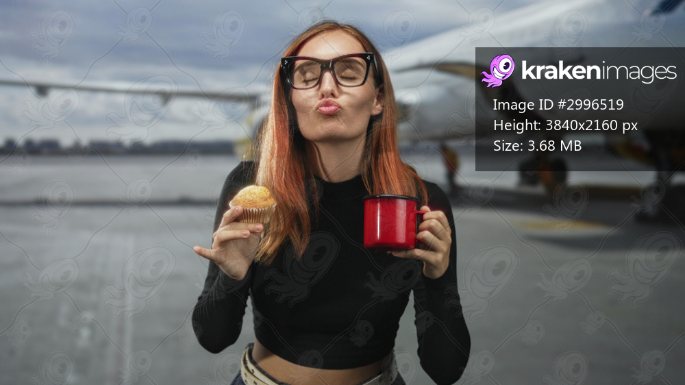 Woman holding red mug and cupcake on airport tarmac beside a parked airplane, wearing glasses and black turtleneck; cheerful travel moment.