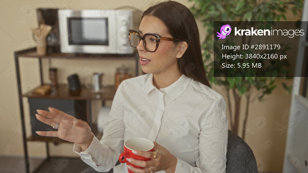 Woman holding red mug gestures with hand in studio office, wearing glasses and white shirt; thoughtful focus.