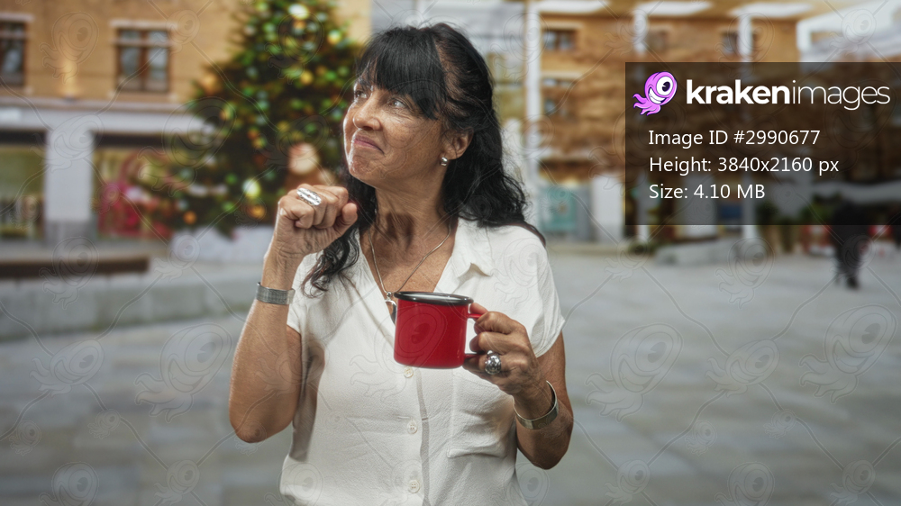Woman holding red mug, gesturing with raised hand and pointing finger on a street decorated for holidays; quiet contemplation.