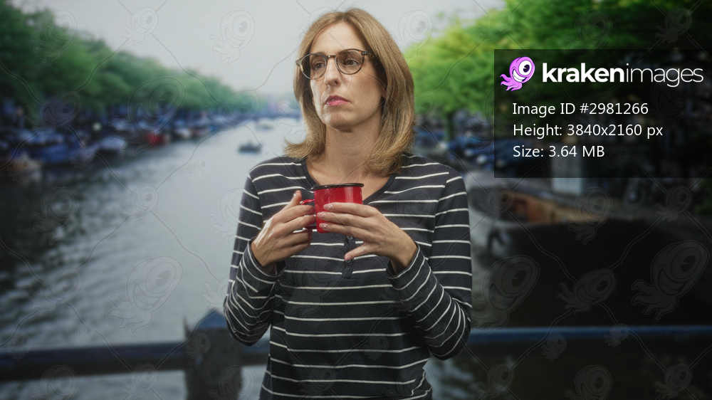 Woman holding red mug, hand on hip, wearing striped top and glasses on canal street by water and boats; quiet disapproval.