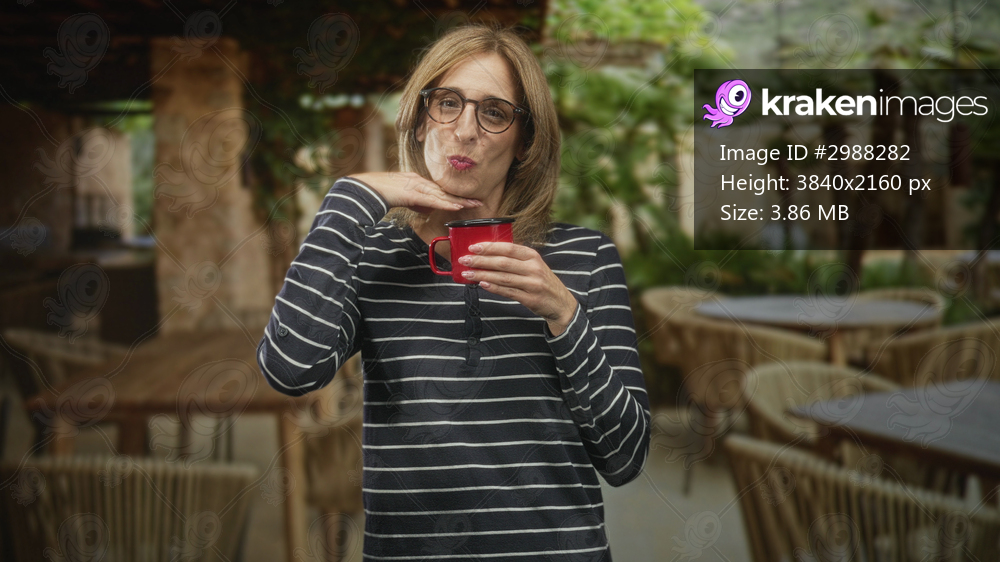 Woman holding red mug with hand under chin gesture, wearing glasses and striped shirt in a building cafe patio; playful delight.