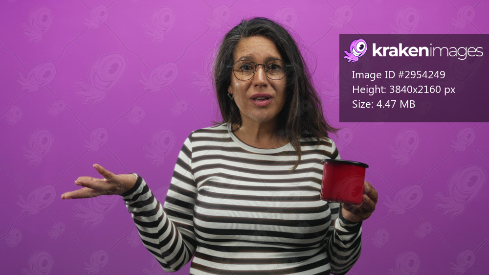 Woman holding red mug, left hand raised slightly palm up questioning gesture in studio; confusion reflection.