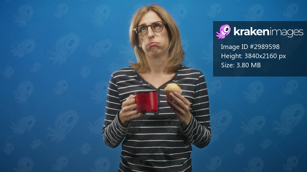 Woman holding red mug and muffin with both hands, wearing striped shirt and glasses, pouting and glancing upward in studio; disappointment.
