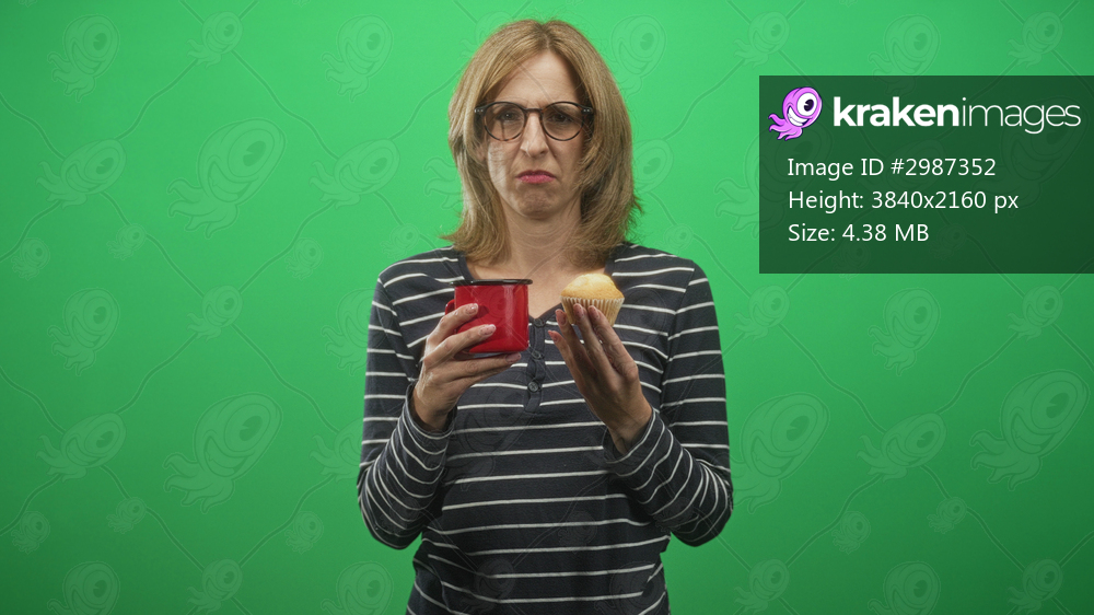 Woman holding red mug and muffin grimacing in studio with green screen, wrinkled nose showing distaste; disgust morning routine refusal.