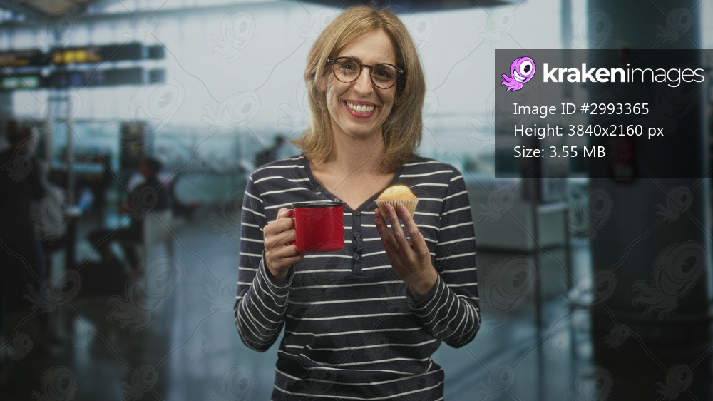 Woman holding red mug and muffin with hands while looking sideways in airport near departure gate; quiet anticipation.