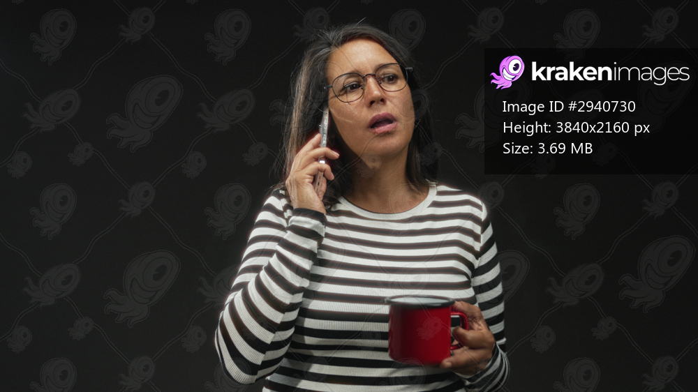 Woman holding red mug and phone to ear in studio, wearing black and white striped shirt and glasses; thoughtful reflection.