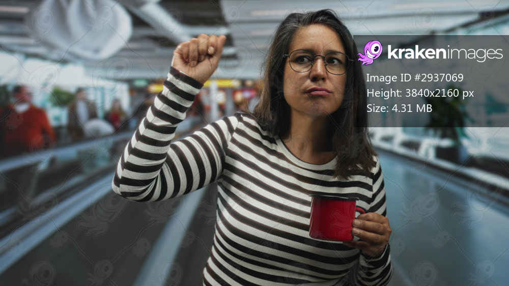 Woman holding red mug and raising fist on airport moving walkway among passengers and terminal signage; resignation patience travel.