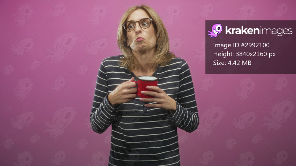 Woman holding red mug and shrug shoulders wearing glasses and striped longsleeve shirt in studio with pink wall; awkwardness playful.