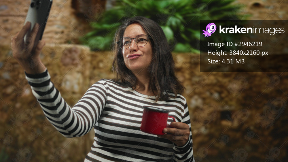Woman holding red mug and smartphone taking selfie with tongue out in a building atrium; playful candid moment.