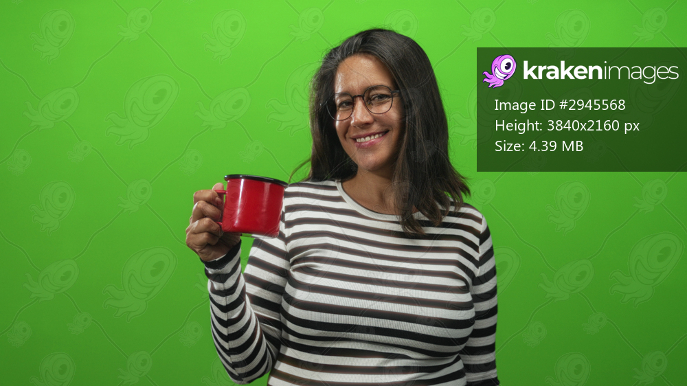 Woman holding red mug up, smiling with one eye closed in green screen studio while wearing striped shirt and glasses; cheerful morning.