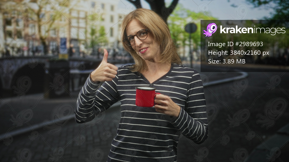 Woman holding red mug while making ok sign, smiling and wearing glasses on cobblestone street; cheerful approval.