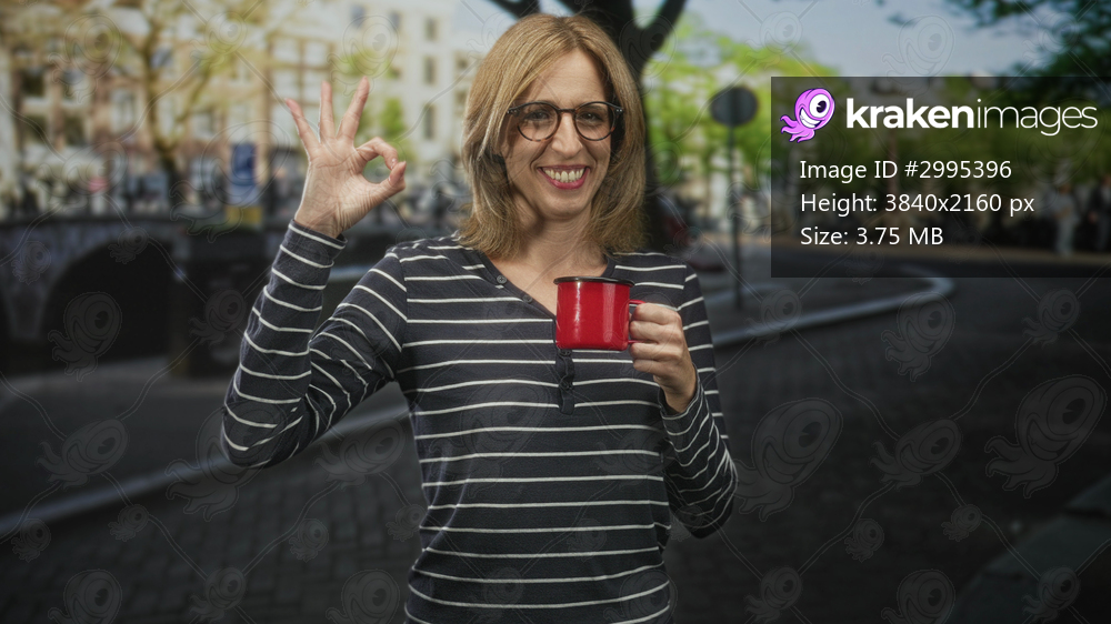 Woman holding red mug while making ok sign, smiling and wearing glasses on cobblestone street; cheerful approval.