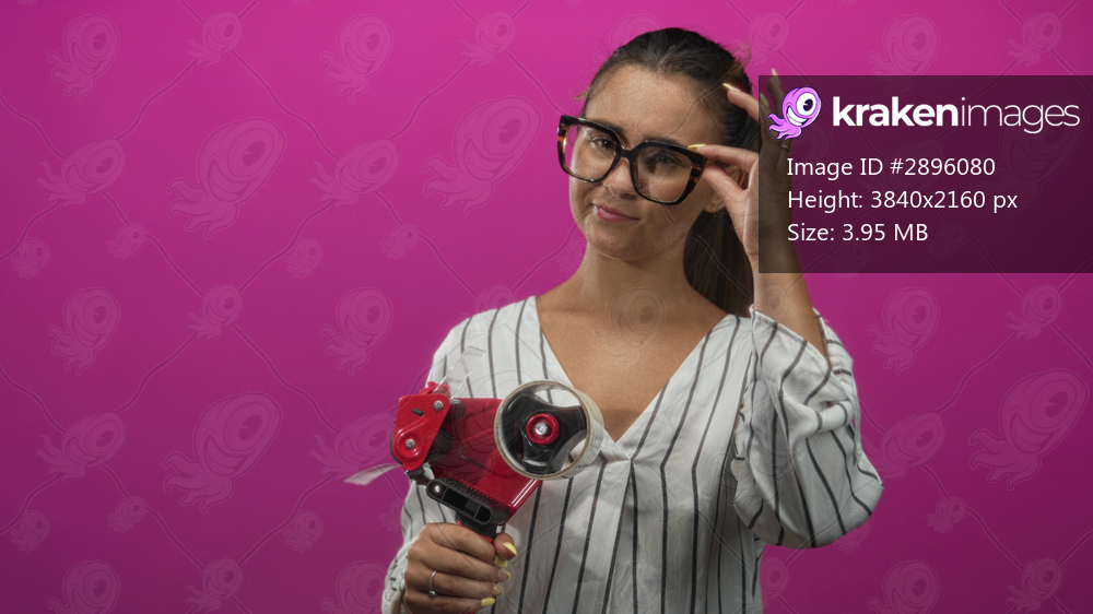 Woman holding red packing tape dispenser and touching glasses in pink studio with striped shirt visible; confidence everyday.