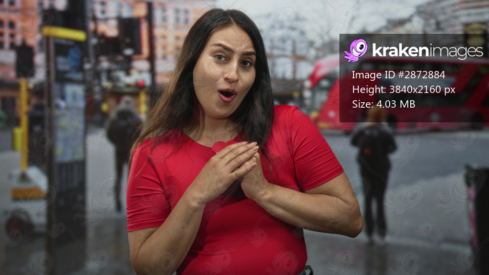 Woman holding red paper heart with hands on chest on a rainy city street near a red doubledecker bus; affection connection.