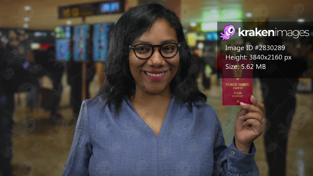 Woman holding red passport and smiling while waiting in airport terminal checkin line; travel anticipation.