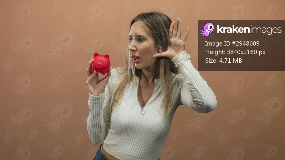 Woman holding red piggy bank and cupping ear in studio with peach background; curiosity about personal savings.