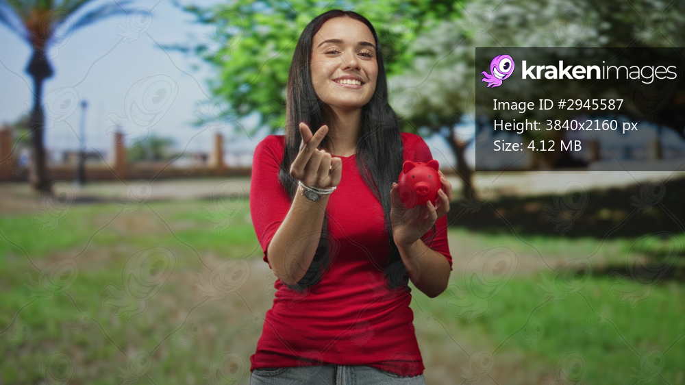 Woman holding red piggy bank and making finger heart gesture in park, smiling with closed eyes and relaxed posture; saving optimism.