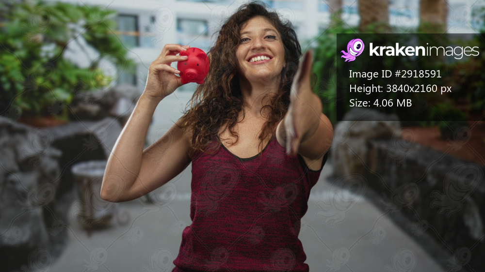 Woman holding red piggybank and offering handshake in a public building walkway, smiling and extending hand; friendly savings.