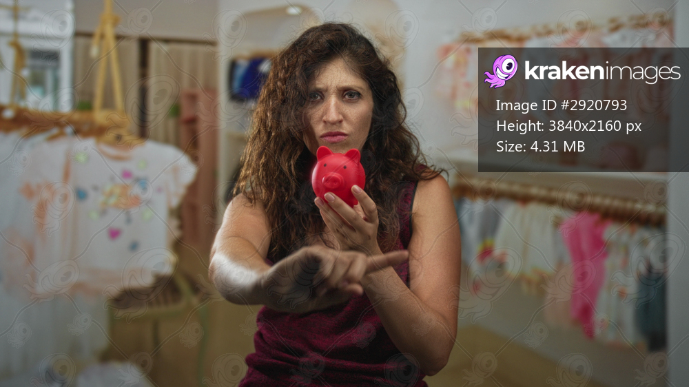 Woman holding red piggybank with outstretched hand and bare arm visible in clothing store building; financial frustration.