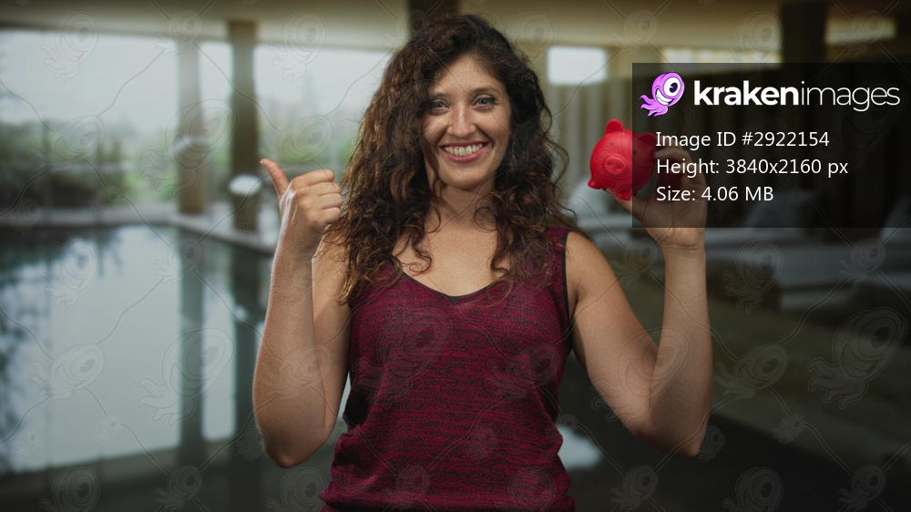 Woman holding red piggybank with right hand and giving thumbs up with left hand in spa; financial optimism.
