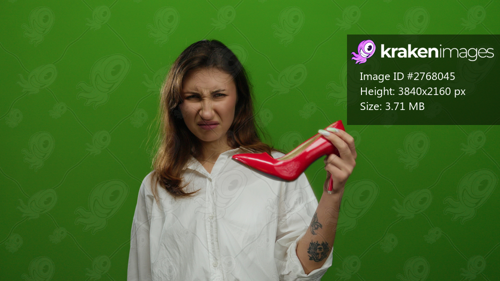 Woman holding red shoe against green background with a perplexed expression, wearing a white shirt, isolated, showcasing a tattoo on her arm in a studio setting. - Kraken Images