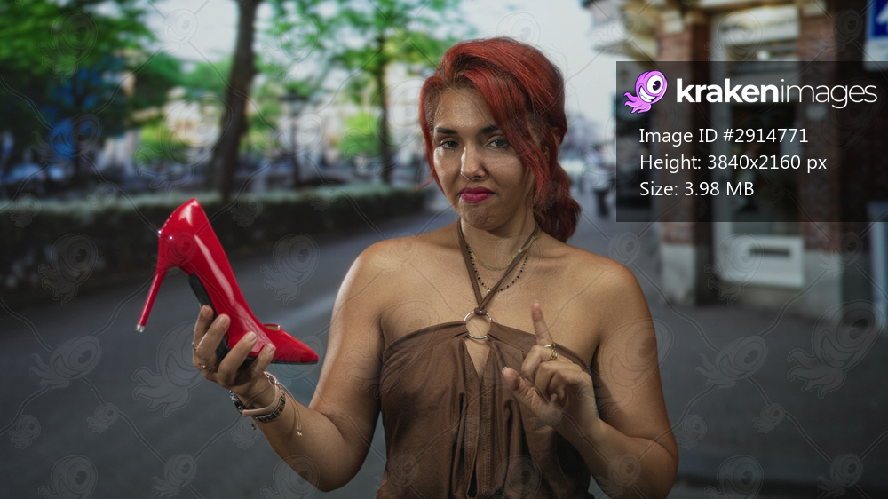 Woman holding red stiletto shoe, finger pointing to shoe on city street while grimacing at the heel; dissatisfaction scrutiny.