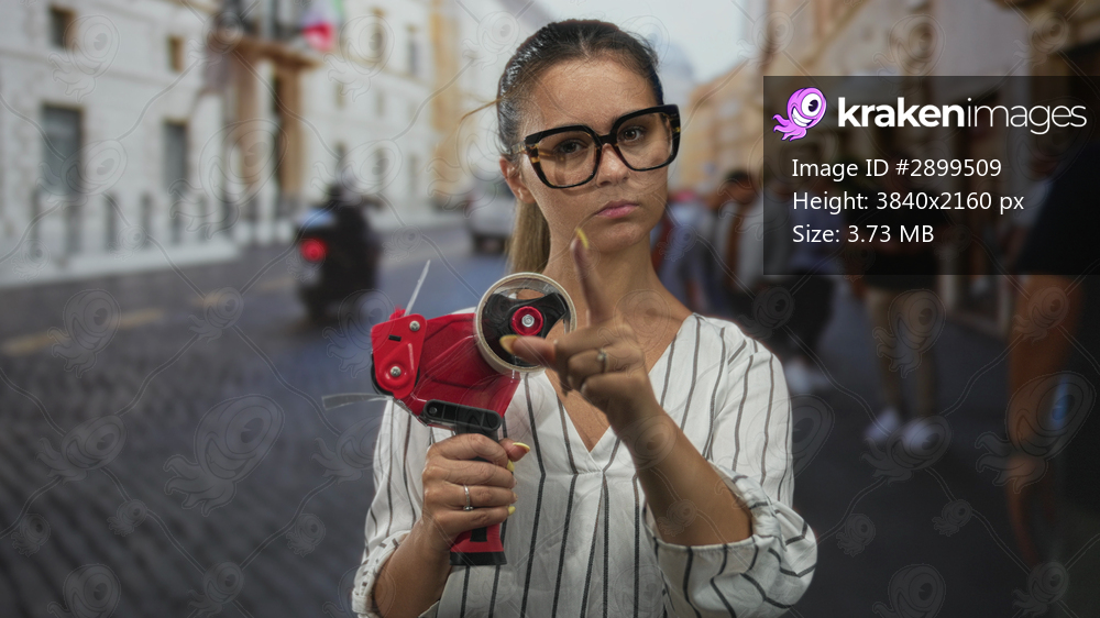 Woman holding red tape dispenser and pointing index finger on a cobbled street with pedestrians and scooter; focus resolve.